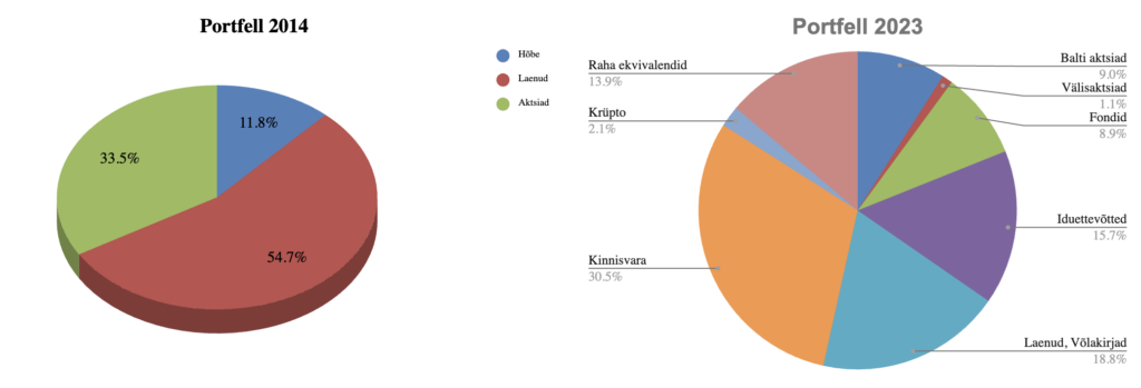 Nii sai tehtud esimene kohendamine ning liikusin 50/50 plaani peale – pool kapitalist laenudes ning pool aktsiates. Mida aeg edasi, seda omanäolisemaks on mu strateegia muutunud. Lisanduma hakkasid erinevad varaklassid ning muutusid ka portfelli osakaalud. Täna on portfellis esindatud kuus erinevat varaklassi ning üle 200 erineva instrumendi. Järgmine graafik iseloomustab hästi strateegia muutumist ajas – vasakul on läbilõige portfellist 2014 aastal ning paremal 2023 aastal.