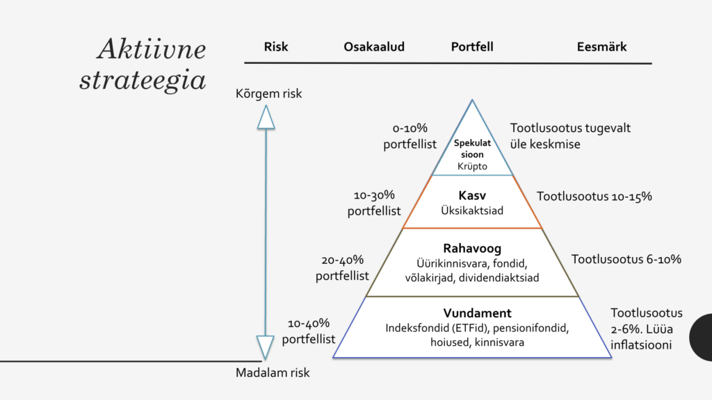 Nendele kuuele küsimusele vastamine aitab selgemaks saada, milline on sinu taustsüsteem, millega strateegiat ehitama hakkad. Millised on su rahalised võimalused, ajaline horisont, aktiivsus, riskitaluvus ning eelised. Kui need vastused on läbimõeldud, siis on lihtne hakata mõtlema portfelli võimaliku kompositsiooni peale.