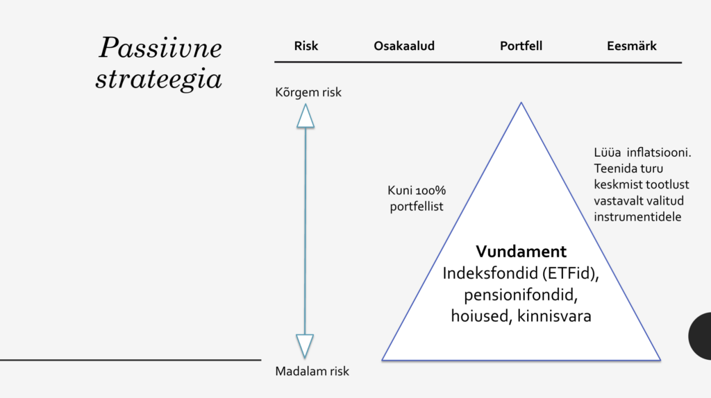 Passiivne investeerimisportfell koosneb suures osas laiapõhjalistest indeksfondidest. Üheks osaks on enamasti ka pensionifondid, mis on kas II või III sambaga kogutud, kuid ka need võivad omakorda olla laiapõhjalised indeksfondi positsioonid. Juurde olen lisanud ka hoiuste instrumendi, mis võib olla mõistlik alternatiiv vaba raha hoidmisele. Ning kolmandaks märkisin ka ära kinnisvara, kuna tõsiasi on see, et elu jooksul enamasti ikkagi kinnisvara koguneb – üks elukoht jääb väikseks ning ostetakse järgmine, kuid eelmist kinnisvara ei soovita ka ära müüa, seega see võtab koha sisse portfellis.